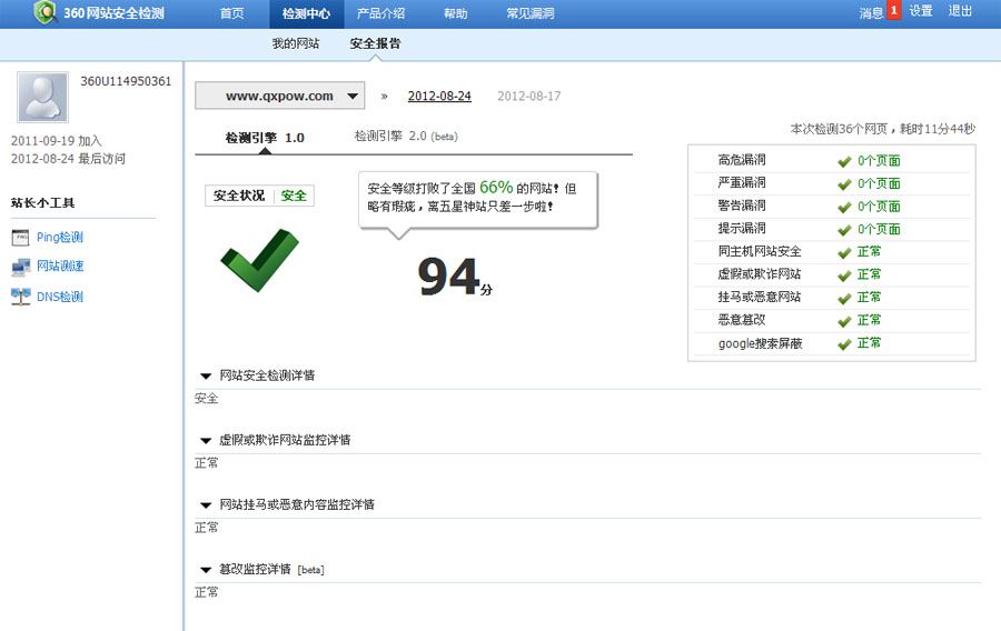 2012年8月24日,騏秀科技網(wǎng)站(www.m.heidashuai.net)通過360網(wǎng)站安全檢測(cè)平臺(tái)的安全評(píng)估,安全報(bào)告顯示網(wǎng)站訪問安全。總體得分94分,雖然沒有滿分,說明做的還不夠好,但安全等級(jí)打敗了全國66%的網(wǎng)站!