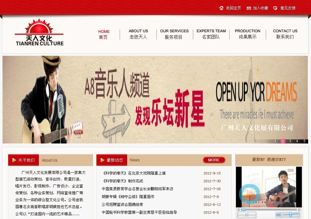 廣州天人文化發(fā)展有限公司是一家以大型活動策劃、企業(yè)歌曲創(chuàng)作、企業(yè)形象推廣為主的大型文化服務公司,公司以“打造國內一流的藝術精品,提升全民高雅的藝術修養(yǎng)”為使命,立足音樂文化產業(yè),服務企業(yè),用文化永葆企業(yè)青春,用文化引領行業(yè)發(fā)展,為建設廣東文化強省作出應有貢獻。