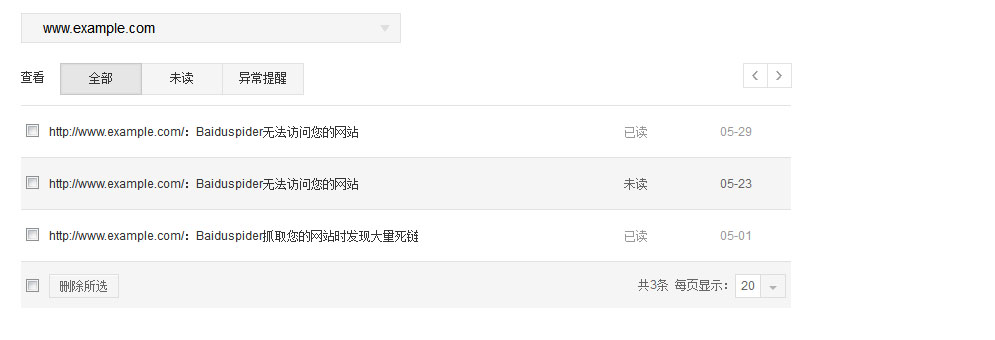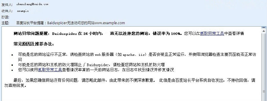 完成上述兩步之后,當(dāng)您的網(wǎng)站在百度中出現(xiàn)異常時(shí),就可在站長(zhǎng)平臺(tái)消息提醒中查看到網(wǎng)站的異常信息,并會(huì)收到來(lái)自百度站長(zhǎng)平臺(tái)的異常提醒郵件。