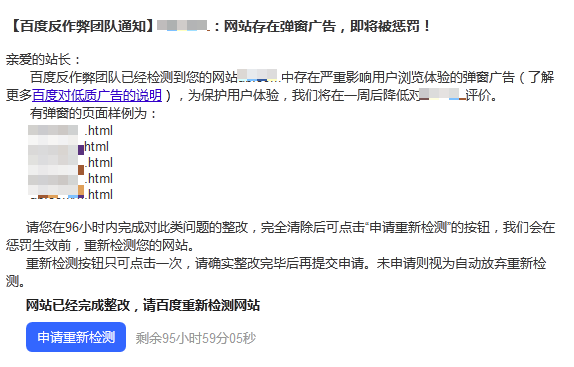 日前,百度站長平臺發(fā)布公告稱,“站點整改反饋功能”已正式上線。據(jù)官方表示,首批通知將以站內(nèi)消息、郵件以及短信三種形式發(fā)送給石榴算法命中站點站長。收到通知后,站長需在96小時內(nèi)進(jìn)行網(wǎng)站整改工作,且應(yīng)在整改完成后申請重新檢測(廣州網(wǎng)站建設(shè)(www.m.heidashuai.net)提醒注意:申請重新檢測的機(jī)會只有一次)。