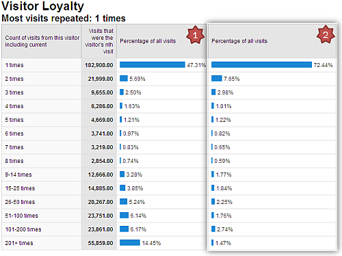 上圖前半部分的數(shù)據(jù)顯示這個(gè)網(wǎng)站顯然第一次訪問的訪次占比達(dá)47%。但更要注意的是,底部的數(shù)據(jù)顯示在一個(gè)月內(nèi)居然有40%的訪問是在用戶當(dāng)月第9次訪問后產(chǎn)生的!下一步我們就可以把前47%的訪次與后40%的訪次相應(yīng)的訪客細(xì)分出來,觀察他們這兩類用戶的訪問行為,從而衡量網(wǎng)站目標(biāo)的達(dá)成狀況。