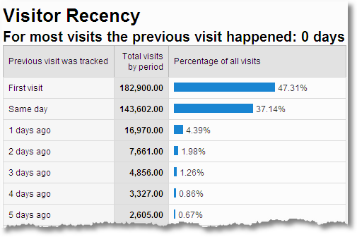 用戶訪問頻度報(bào)告可以給我們提供很多有用的信息,而用戶新近度的數(shù)據(jù)也值得我們?nèi)リP(guān)注,特別是對(duì)內(nèi)容資訊類的網(wǎng)站而言。訪客新近度測(cè)量的是同一個(gè)訪客的兩次訪問之間的時(shí)間差距,或者說,你上一次見到這個(gè)人(Cookies訪客ID)是什么時(shí)候。以下是GA的用戶新近度報(bào)告示例: