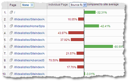 如上圖所示,紅色的指示條表示的是頁面的跳出率高于網(wǎng)站平均跳出率水平的幅度,那些頁面可能有著較大的優(yōu)化空間。Top10著頁面中,有3個(gè)著陸頁的跳出率明顯低于網(wǎng)站的平均水平,有6個(gè)著陸頁的跳出率明顯偏高。