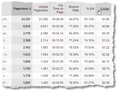 進(jìn)入內(nèi)容報(bào)告,上圖最右邊那列即為頁面價(jià)值數(shù)據(jù)。Top10頁面的頁面價(jià)值為$8.79至$0.10不等。了解了這些數(shù)據(jù),就可以知道我們應(yīng)該為客戶提供哪些內(nèi)容,從而可以創(chuàng)建更大的價(jià)值。