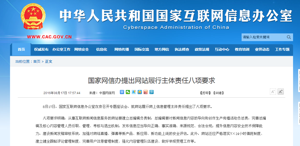 8月17日,國家互聯(lián)網(wǎng)信息辦公室在京召開專題座談會,就網(wǎng)站履行網(wǎng)上信息管理主體責(zé)任提出了八項要求。